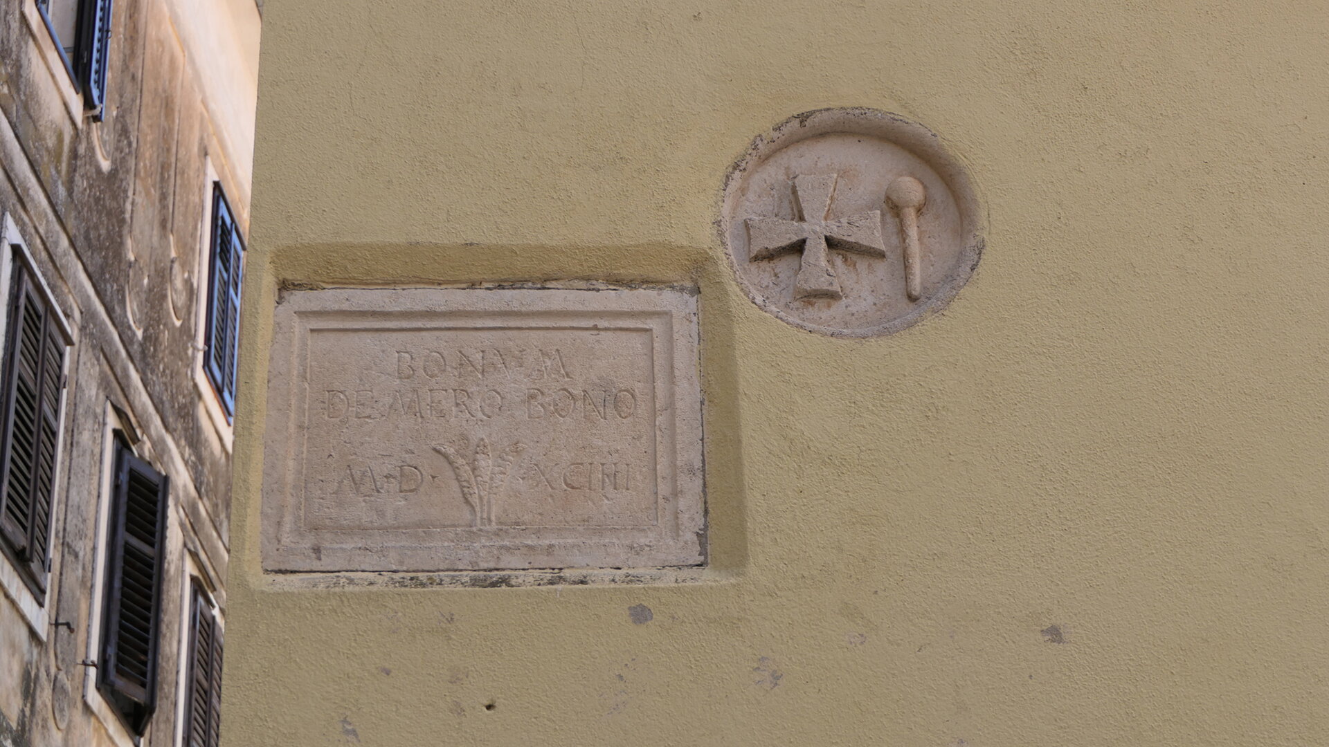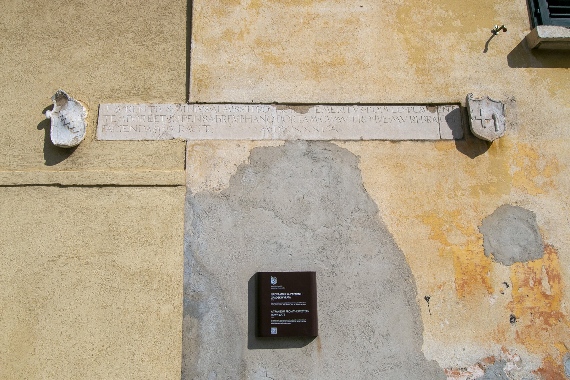 Grb Omiša, uzidan s bočne strane dvokatnice sagrađene na mjestu gdje je za vrijeme mletačke uprave bila gradska loža i pisarna. Do njega se nalazi ploča s krilaticom BONUM DE MERO BONO („Dobro nam dolazi iz čistoga dobra“) i godinom 1594.