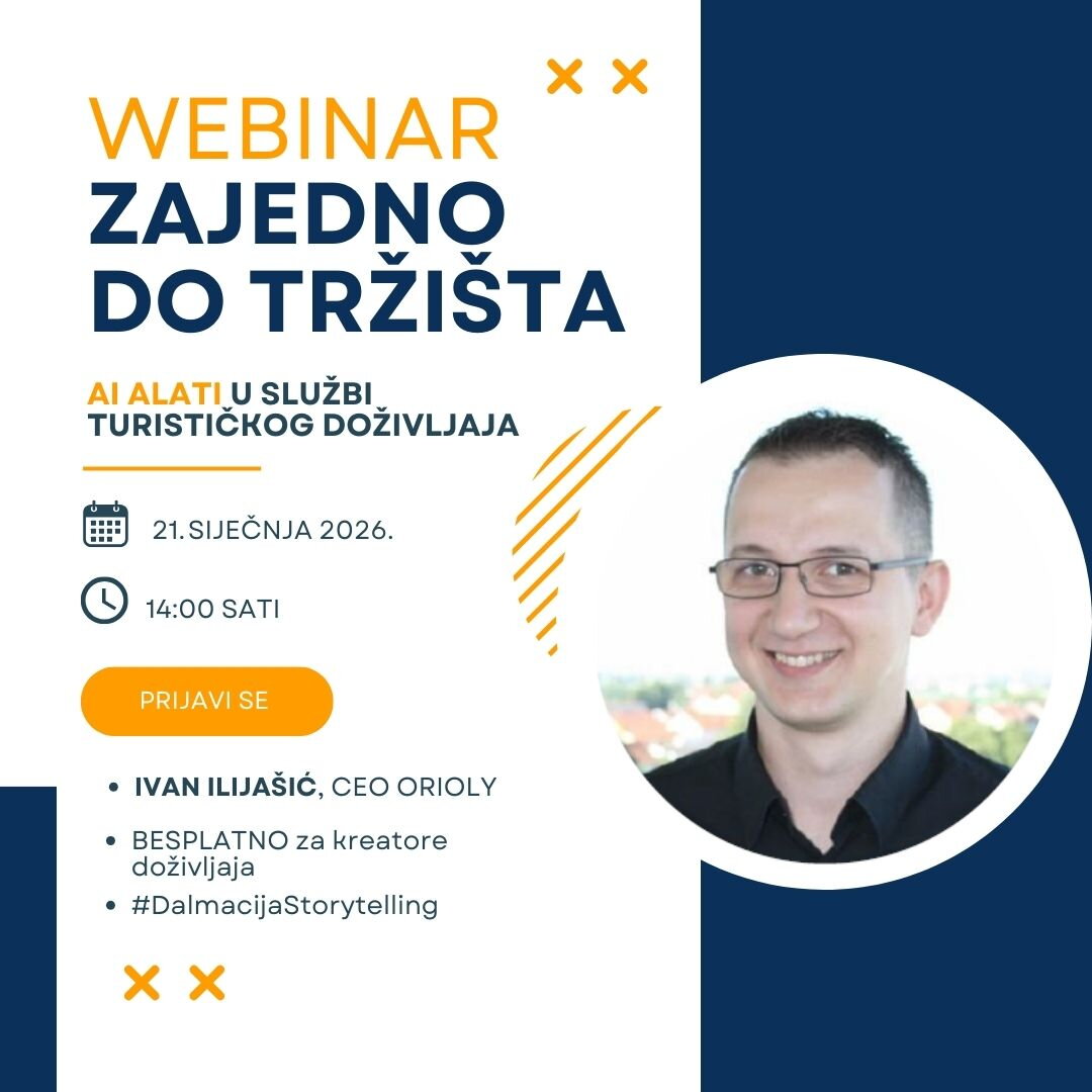 Prvi webinar, “AI alati u službi turističkog doživljaja: od planiranja do personalizacije i marketinga”, održat će se u srijedu, 21. siječnja 2026. u 14 sati. Predavač je Ivan Ilijašić, osnivač i CEO platforme Orioly, koji će predstaviti alate umjetne inteligencije i njihovu primjenu u turizmu za osmišljavanje novih tura, pisanje opisa, prilagodbu ponude različitim gostima i lakšu pripremu promotivnih sadržaja.